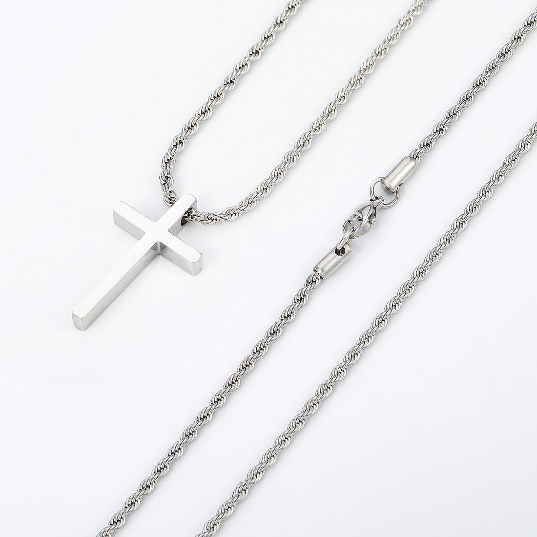 Silvery, stainless steel men's button rope chain cross necklace, 2.5mm, cross pendant necklace, 16-24 inches