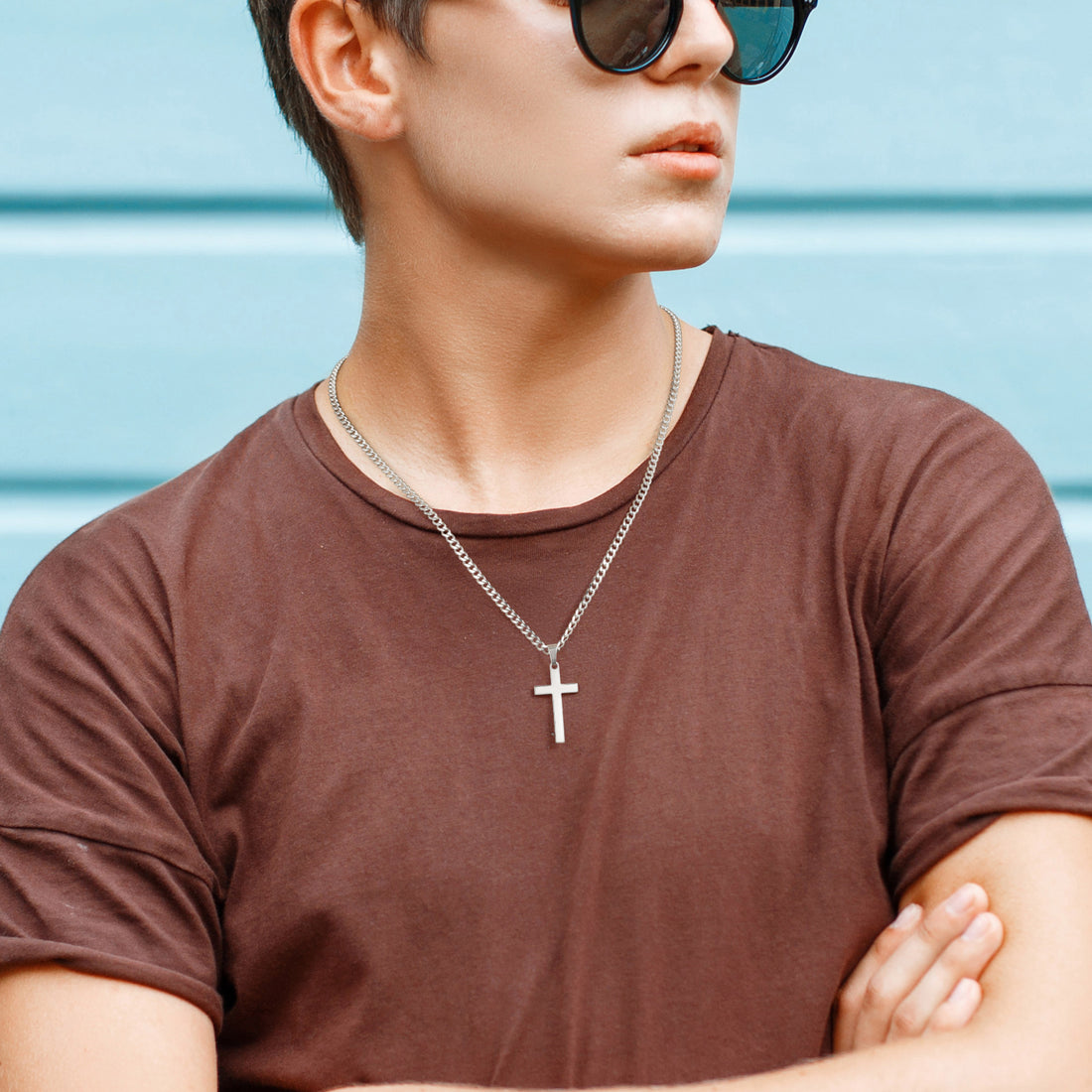 Silvery, stainless steel men's Cuban chain cross necklace, 2.5mm, cross pendant necklace, 16-24 inches