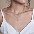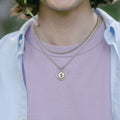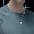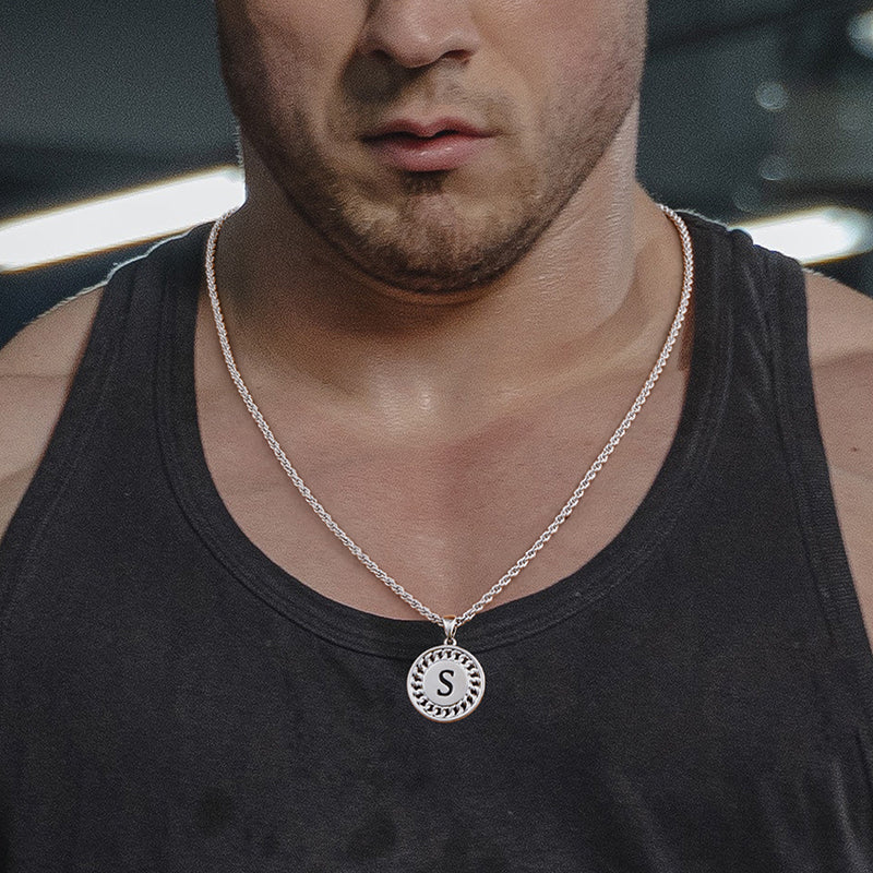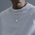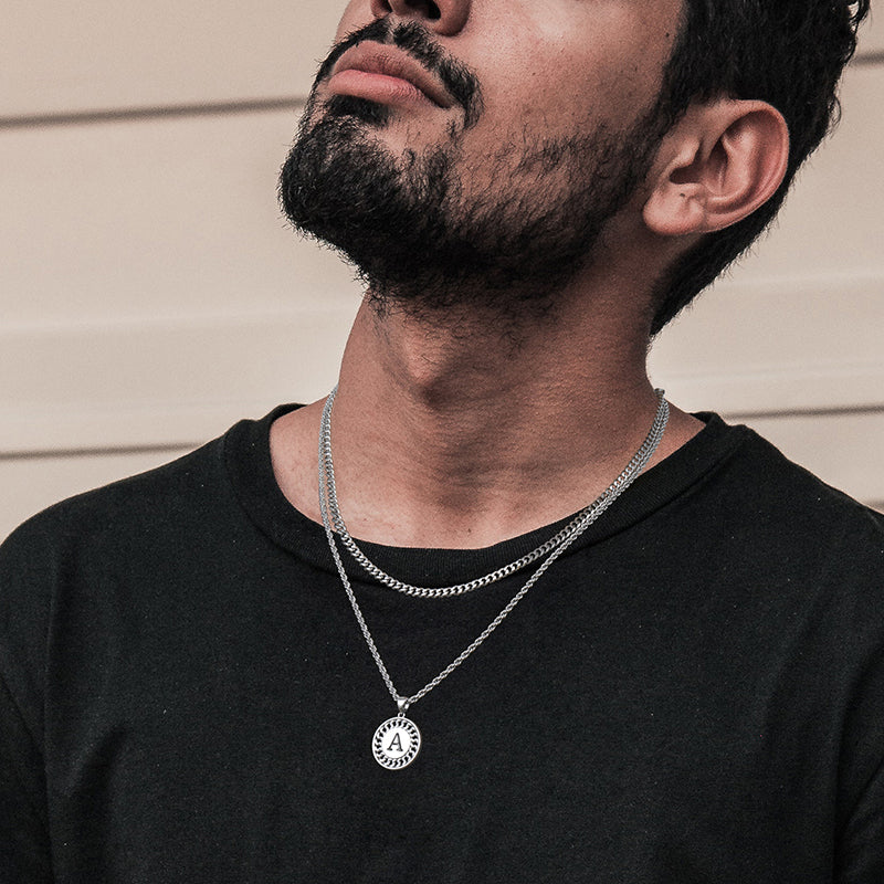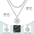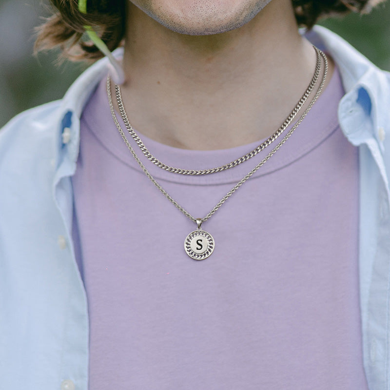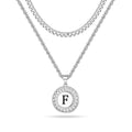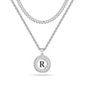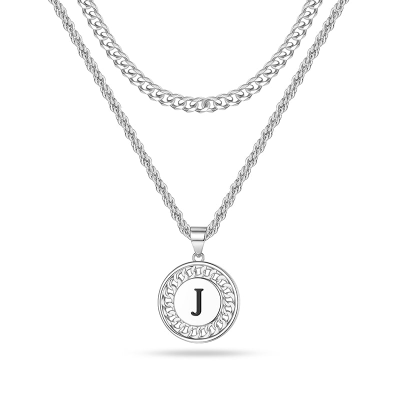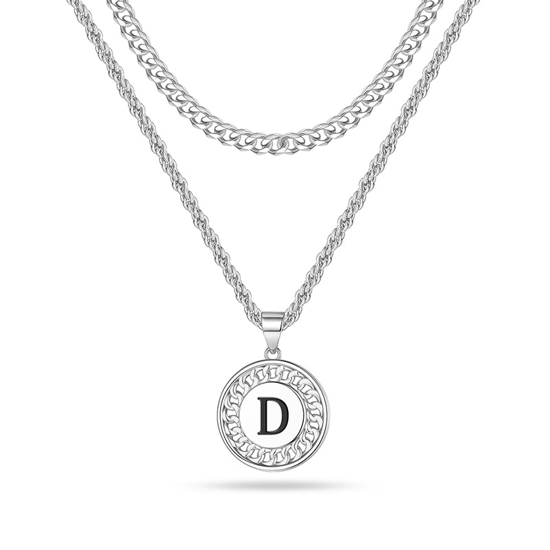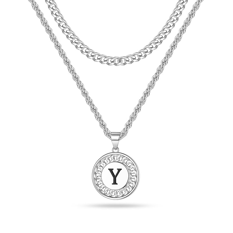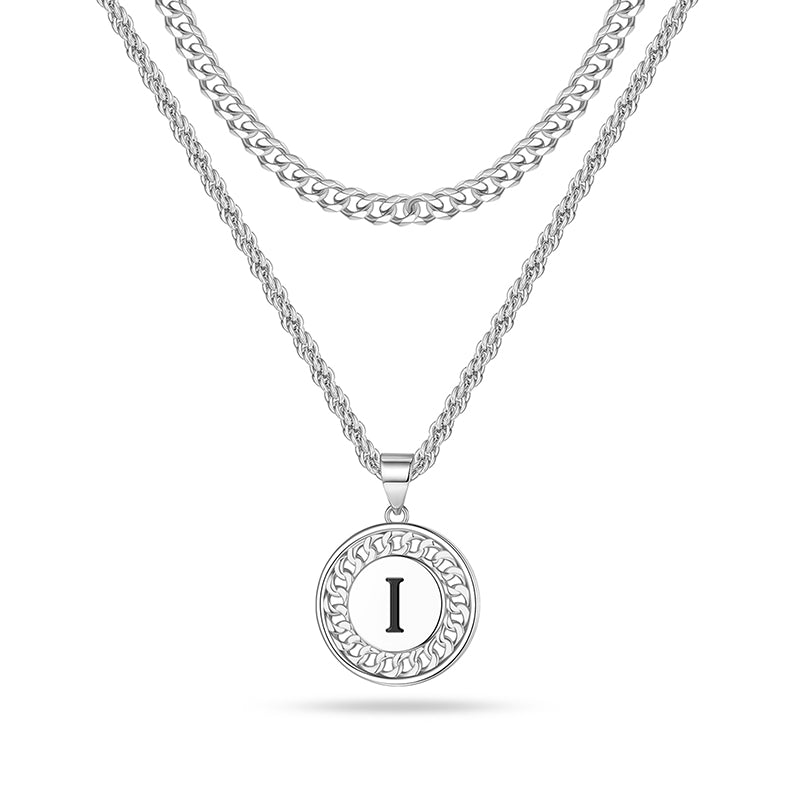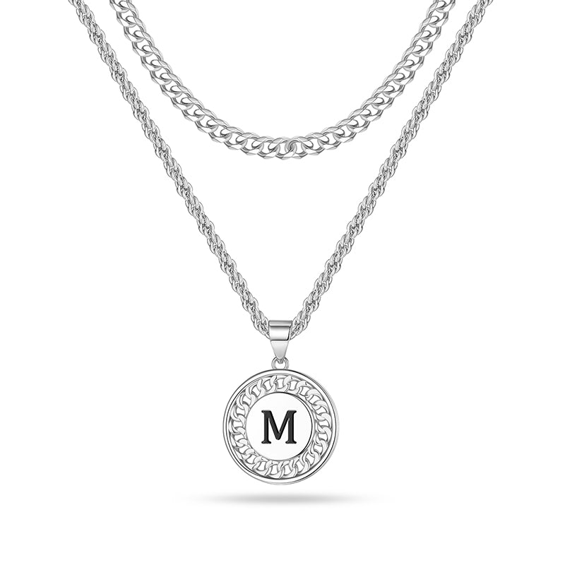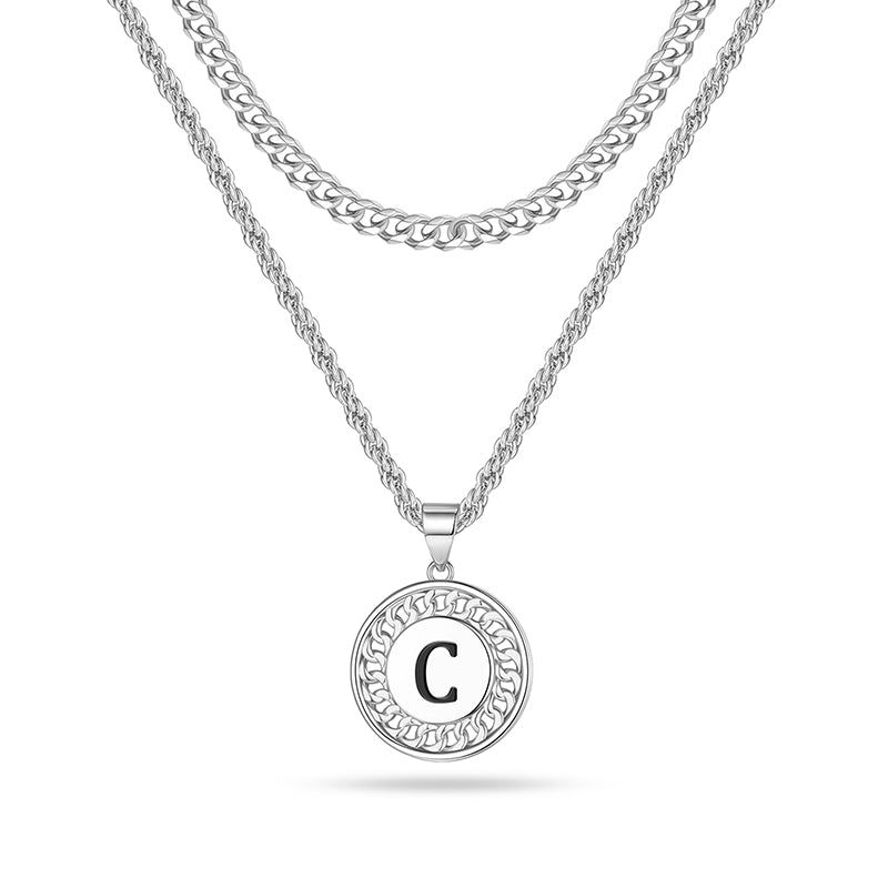Silvery, Cuban chain and rope chain double layered chain necklace, black letter circular hanging tag necklace, style 1- silver hollow out