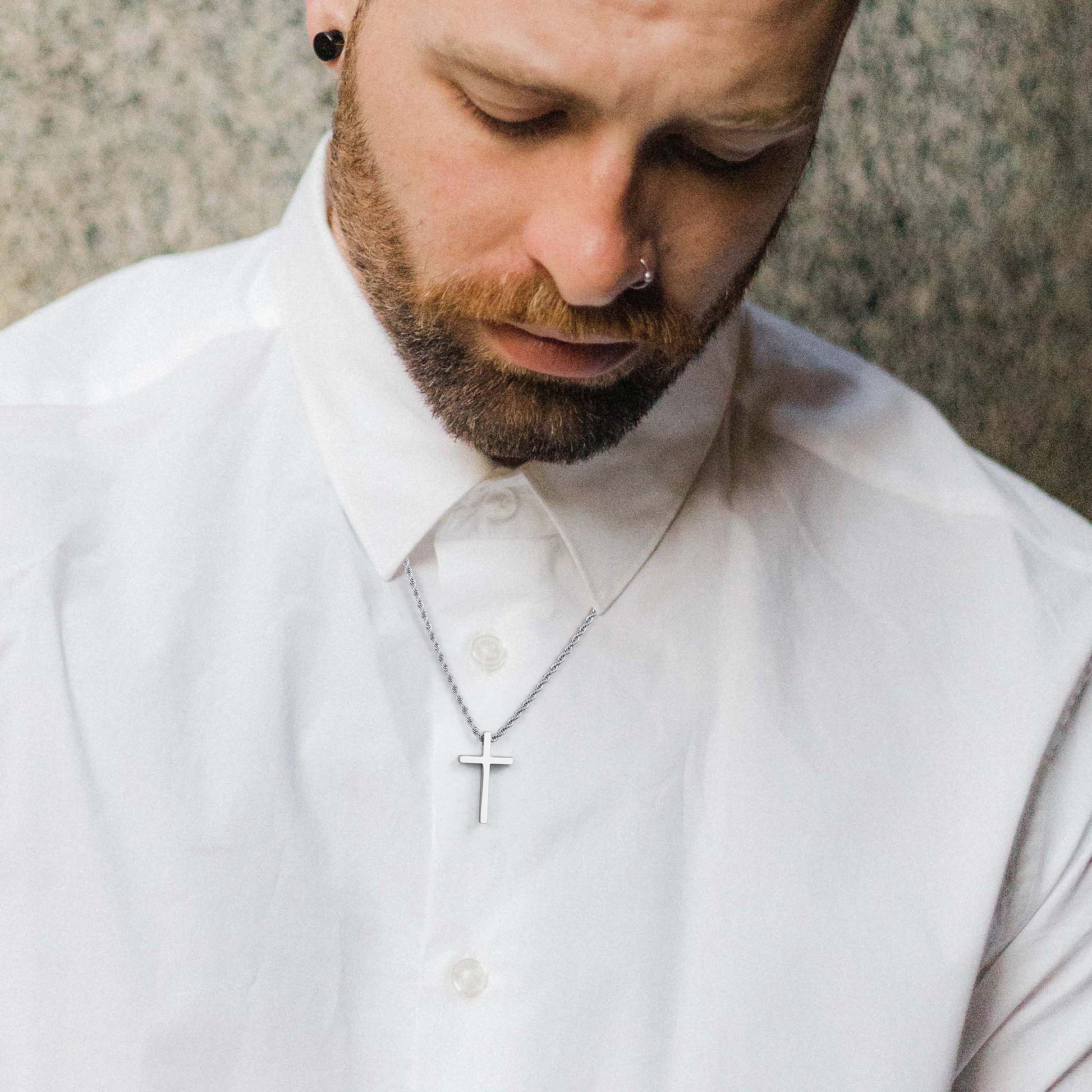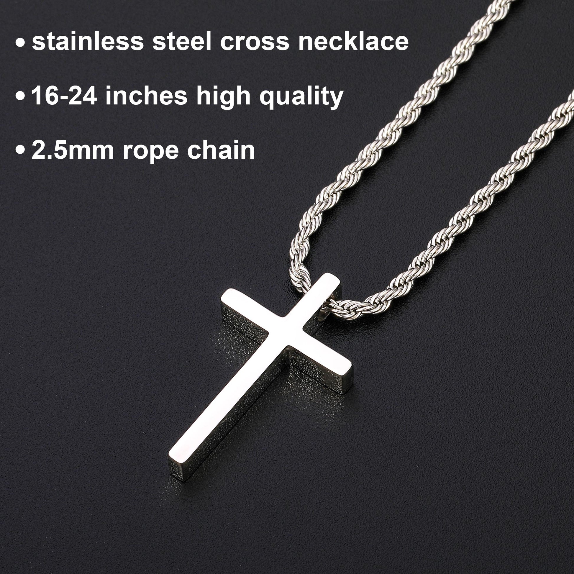Silvery, stainless steel men's button rope chain cross necklace, 2.5mm, cross pendant necklace, 16-24 inches