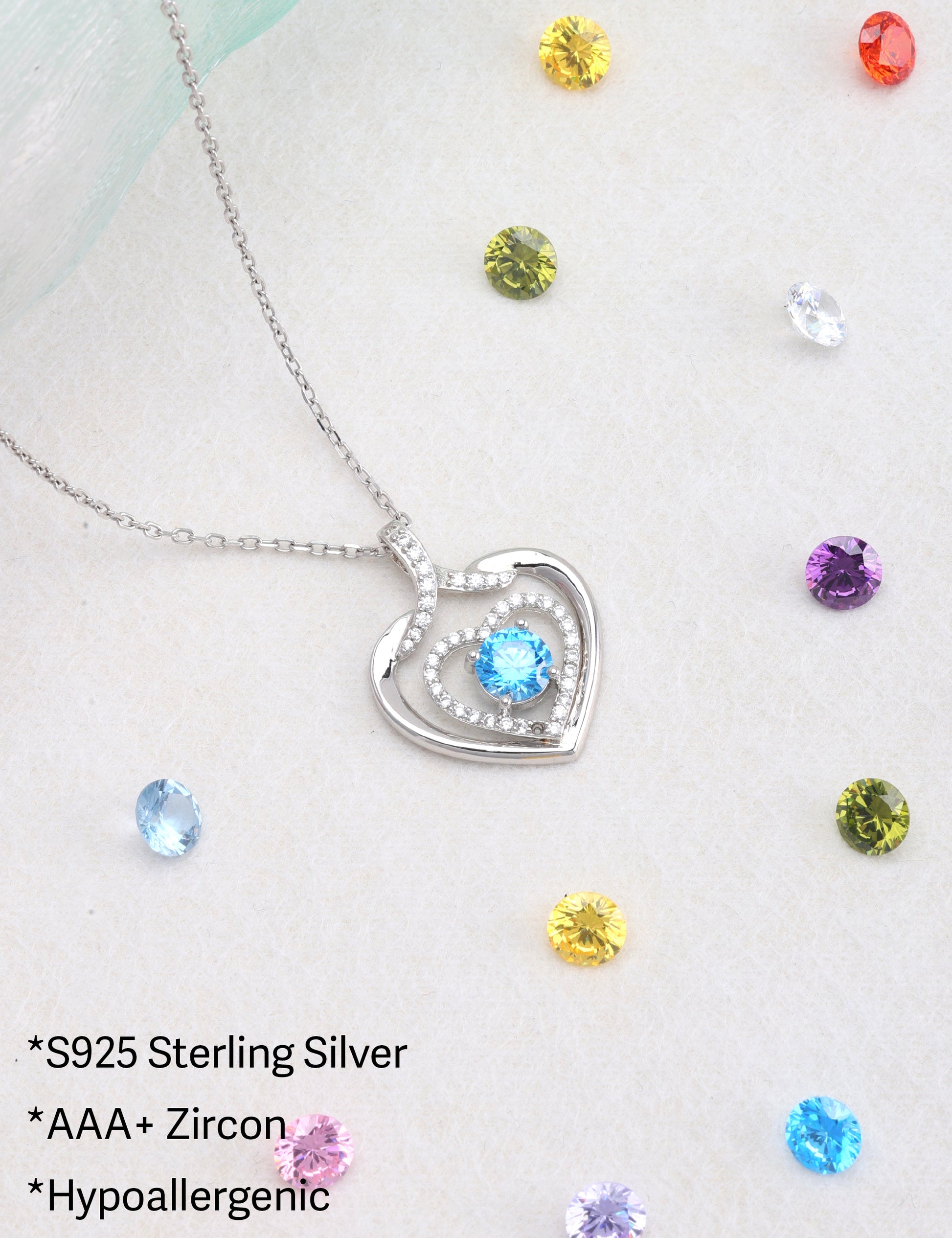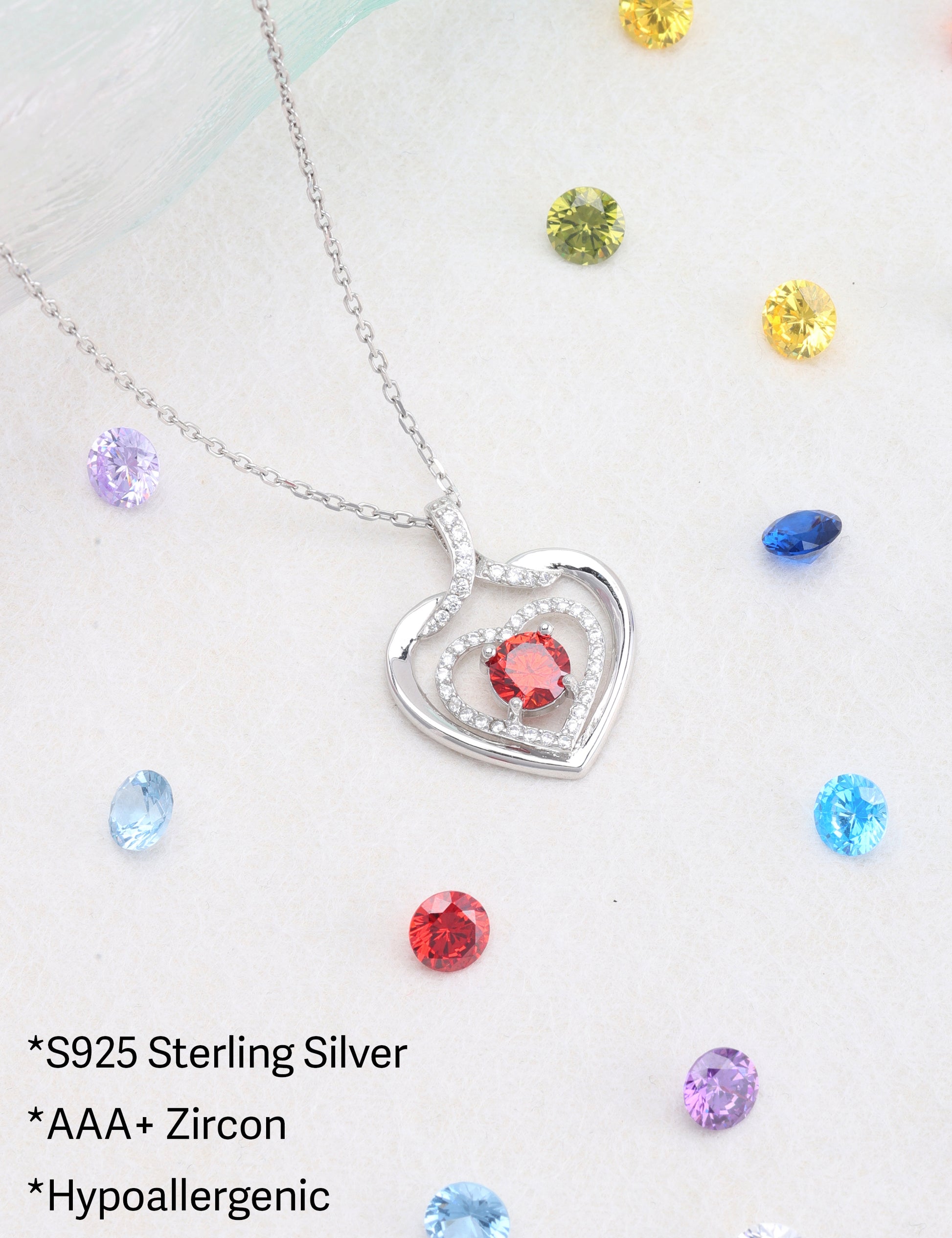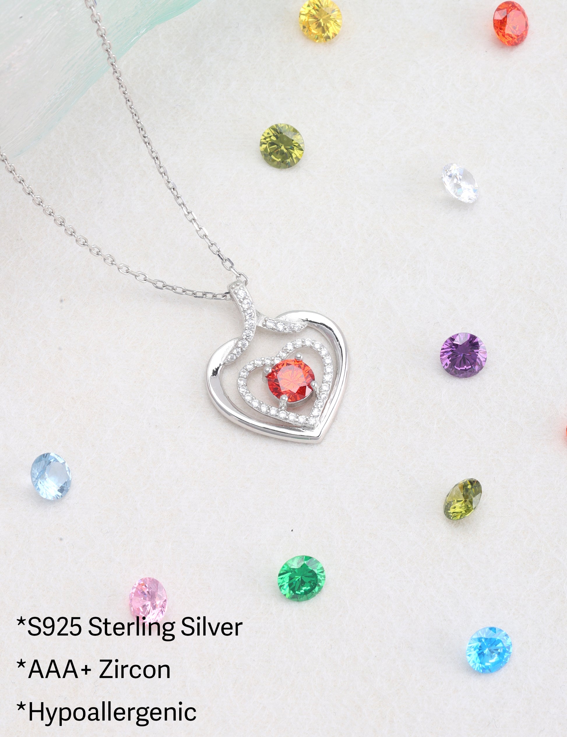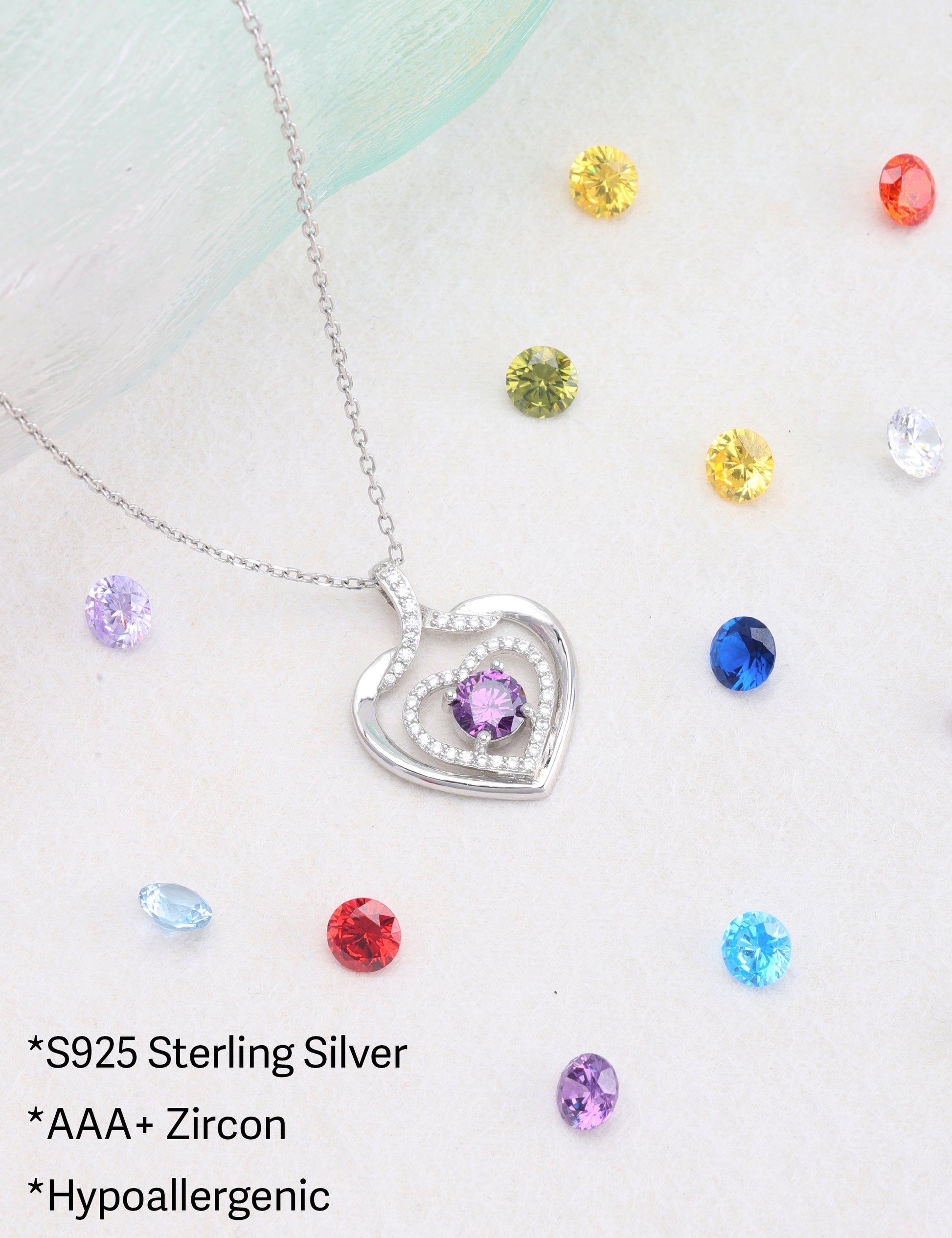 925 silver plated material: The birthstone heart-shaped necklace is made of high-quality silver plating, which is a safe material with low allergenicity and antioxidant properties, and will not irritate the skin. The length of the birthstone necklace is 45.08+3.5 centimeters, suitable for most people.