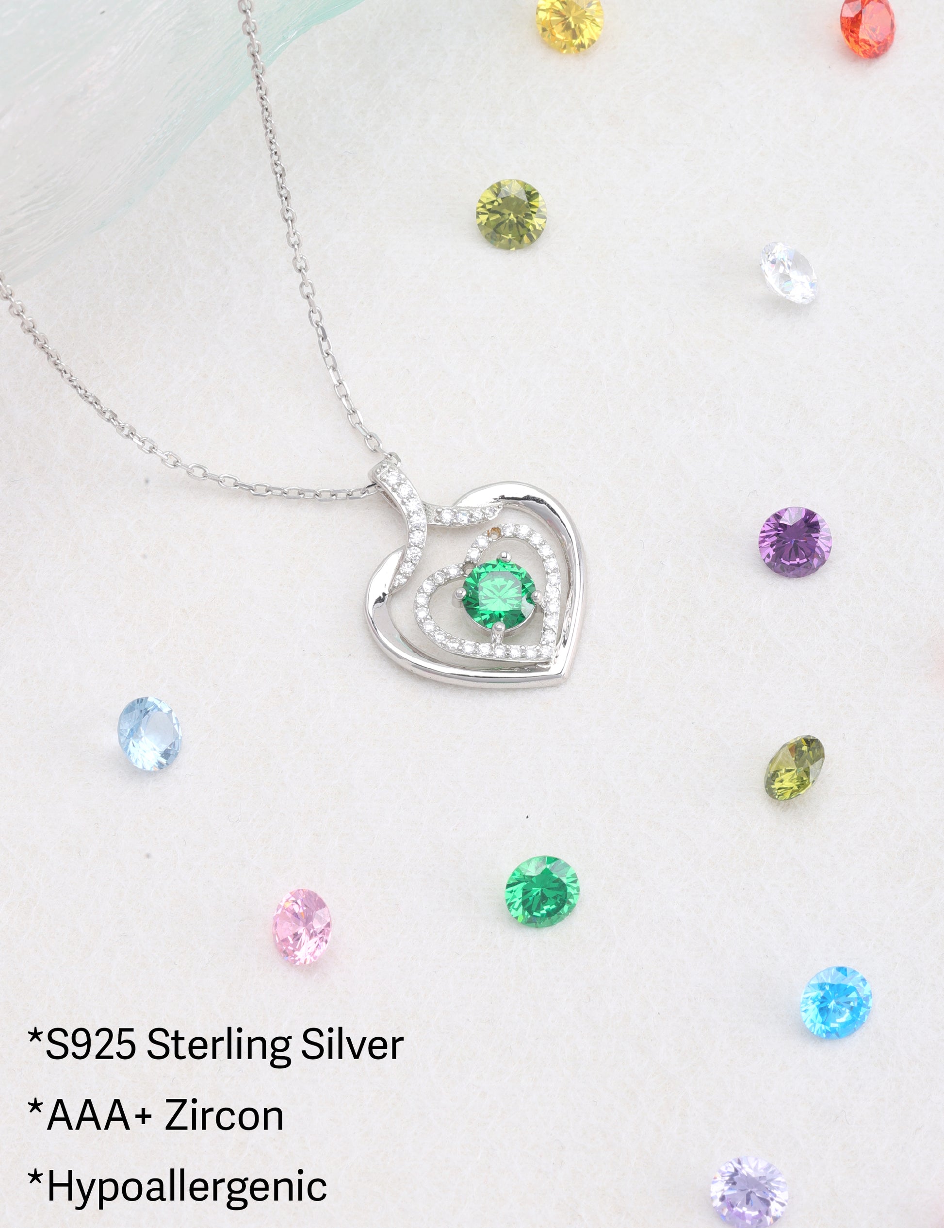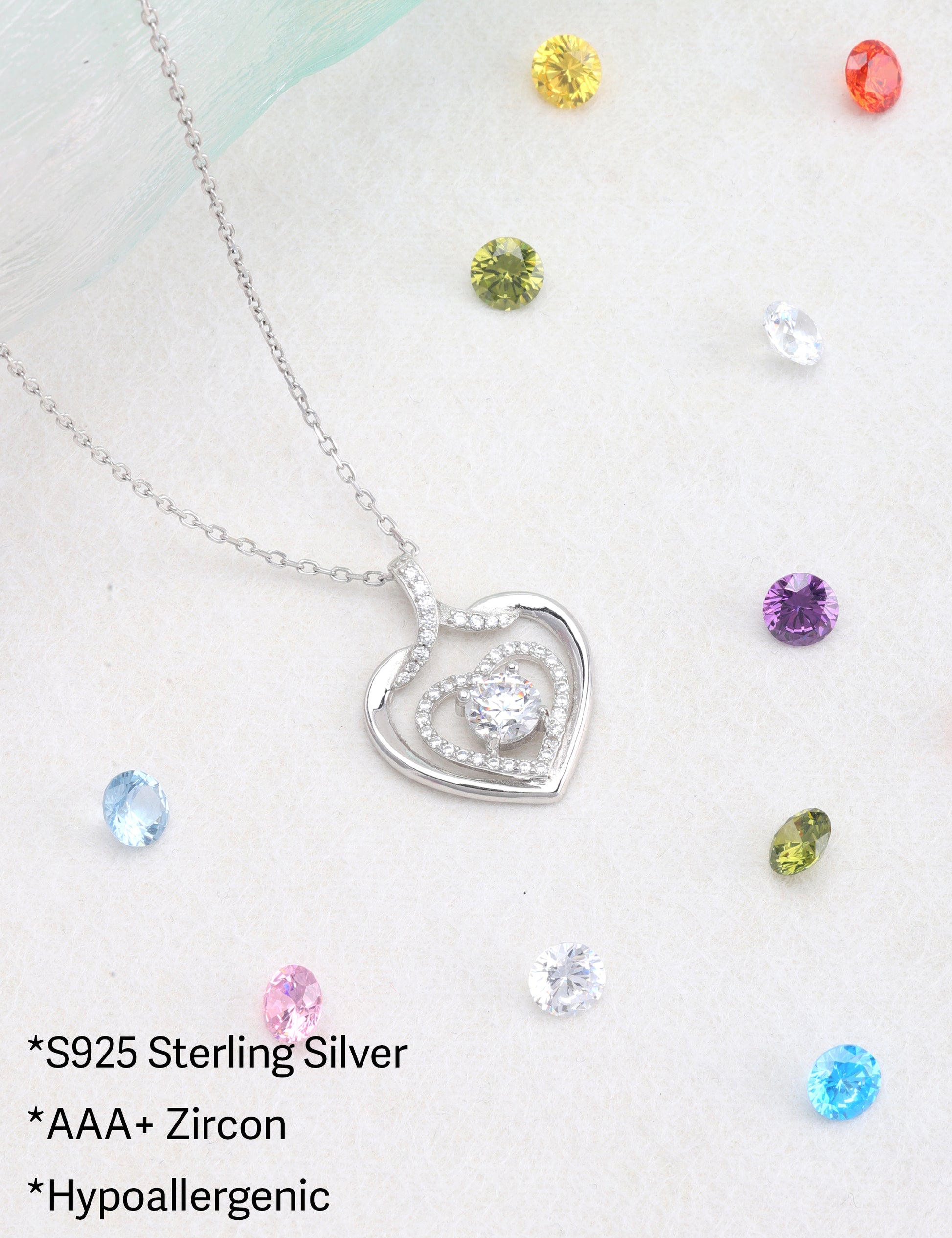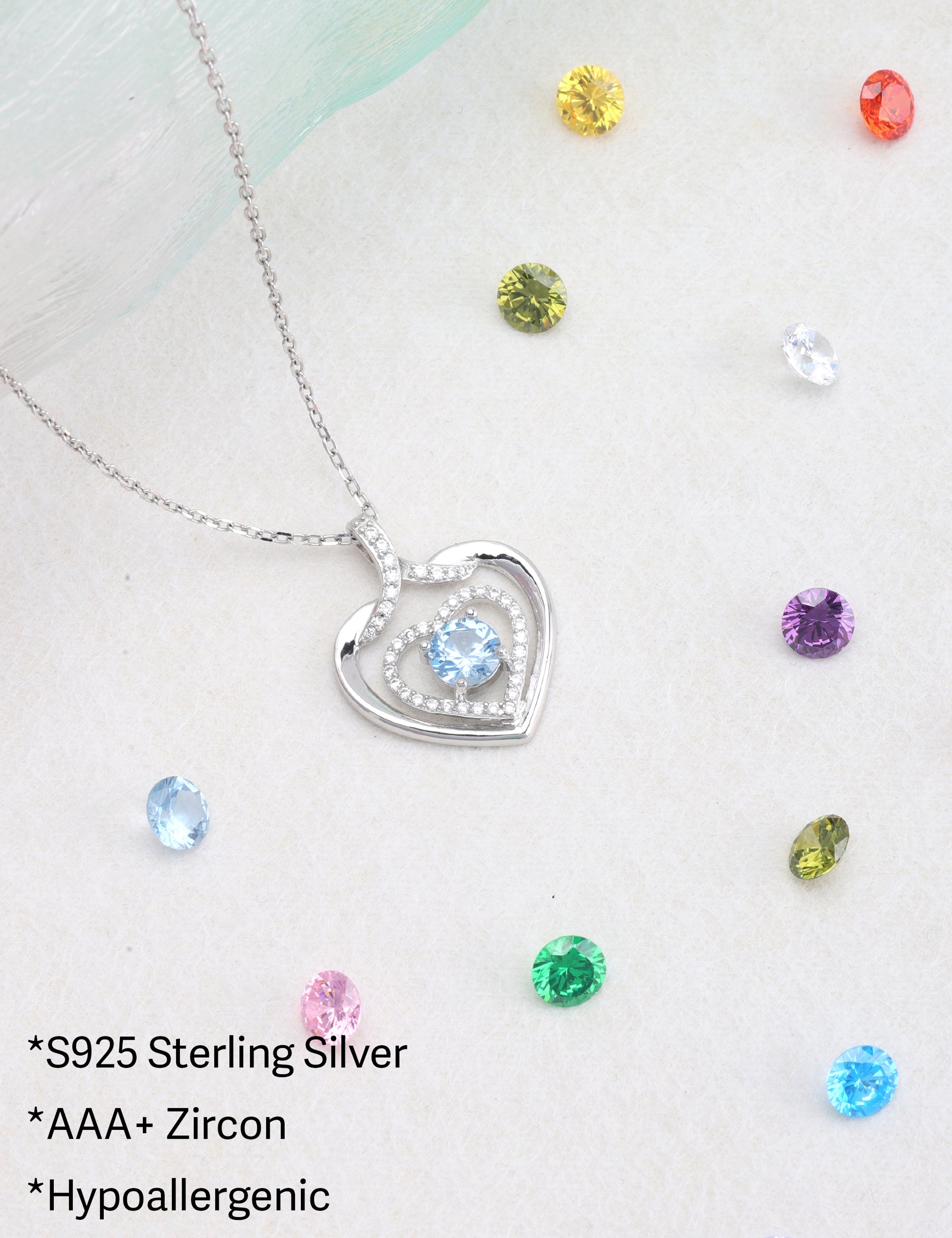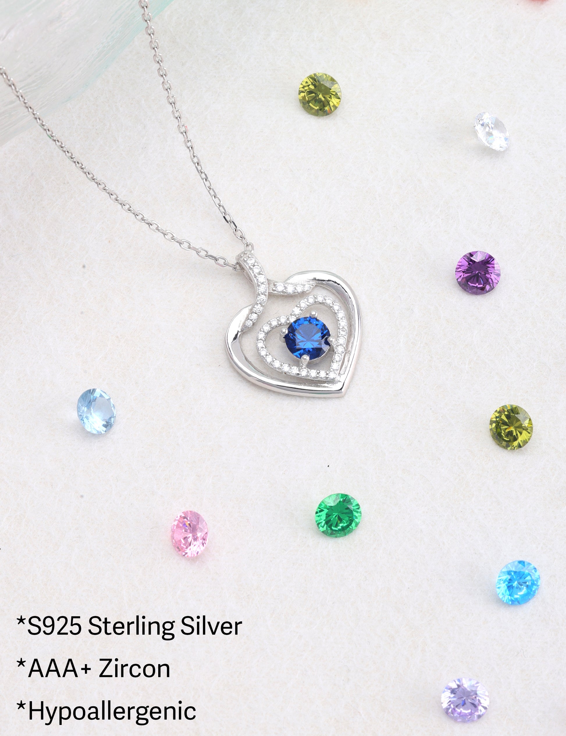 925 silver plated material: The birthstone heart-shaped necklace is made of high-quality silver plating, which is a safe material with low allergenicity and antioxidant properties, and will not irritate the skin. The length of the birthstone necklace is 45.08+3.5 centimeters, suitable for most people.