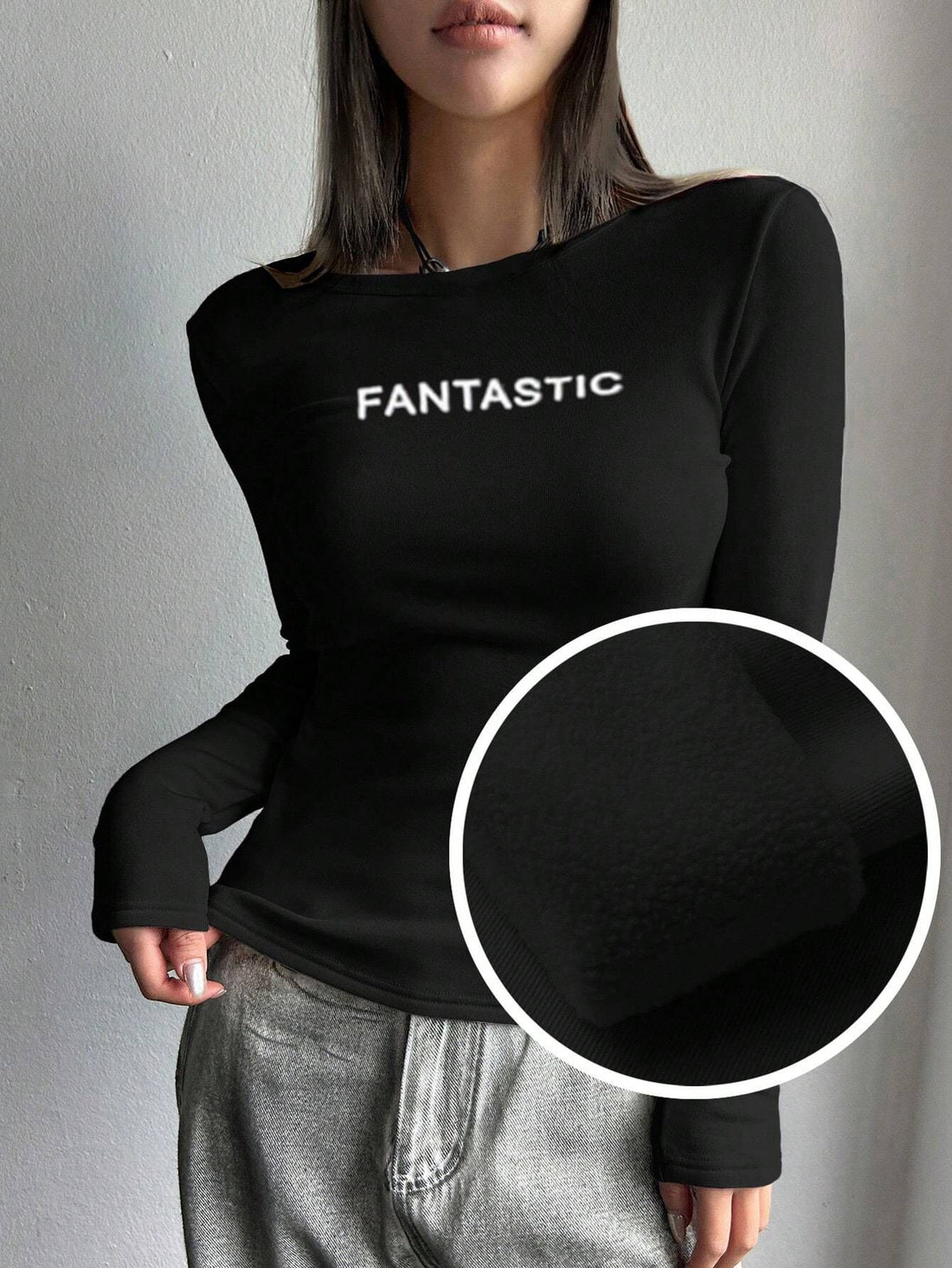 Black, women's velvet base shirt, long sleeved round neck tight fitting shirt, with FANTASTICH white letters printed on the chest