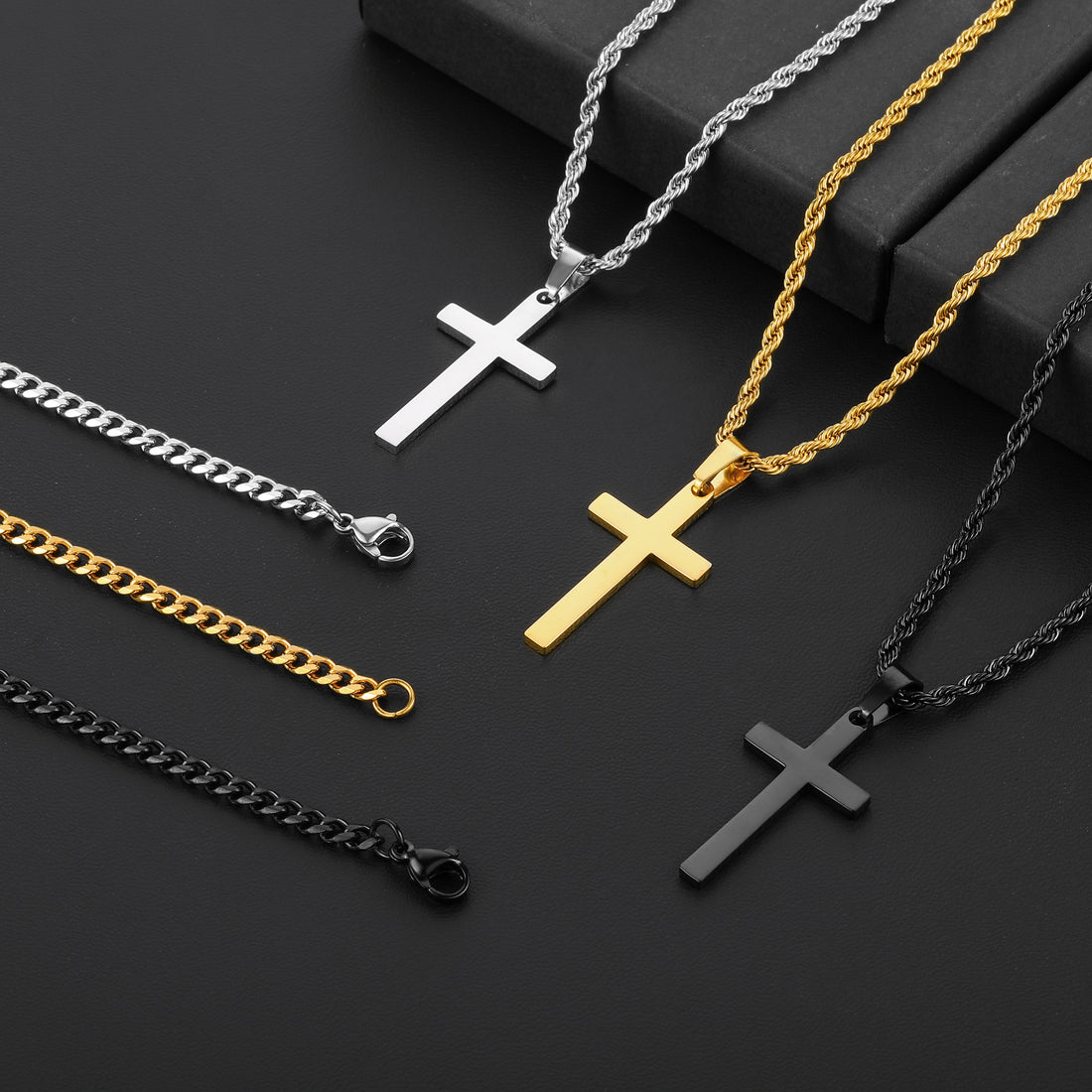Black/Golden/Silvery, Short 3 to 1 Chain, Extended Box Chain, Double Layer Chain, Cross Tag Necklace, Style E1 Figaro&Box Buckle