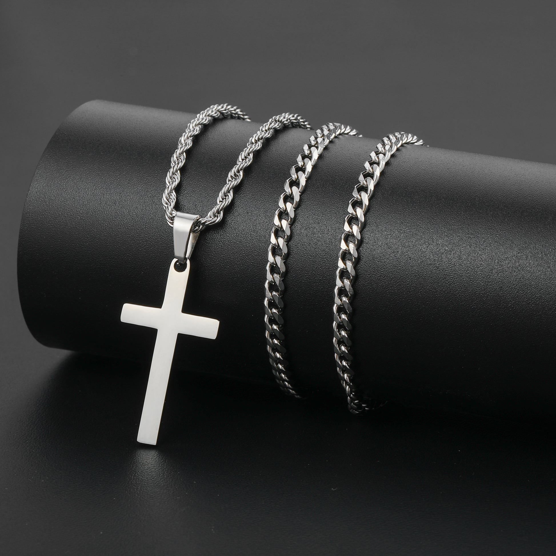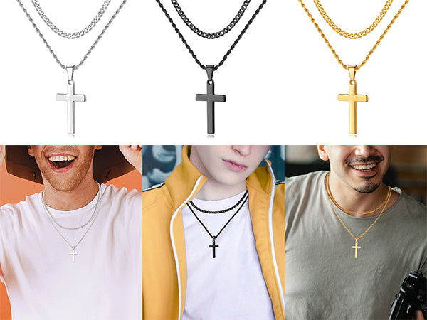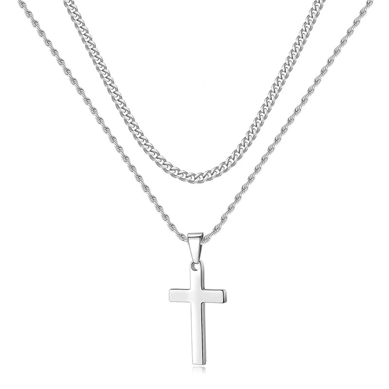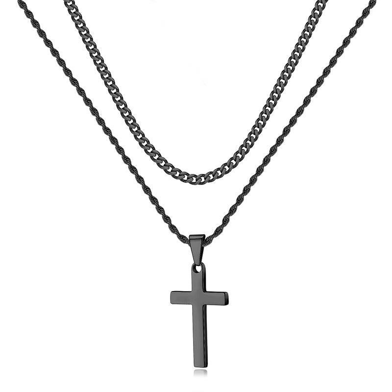 Black/Golden/Silvery, Short Cuban Chain, Extended Rope Chain, Double Layer Chain, Cross Tag Necklace, Style B - Cuban and Rope Hole