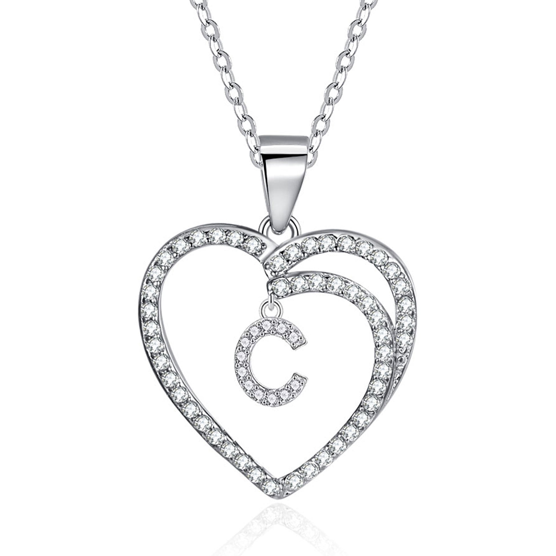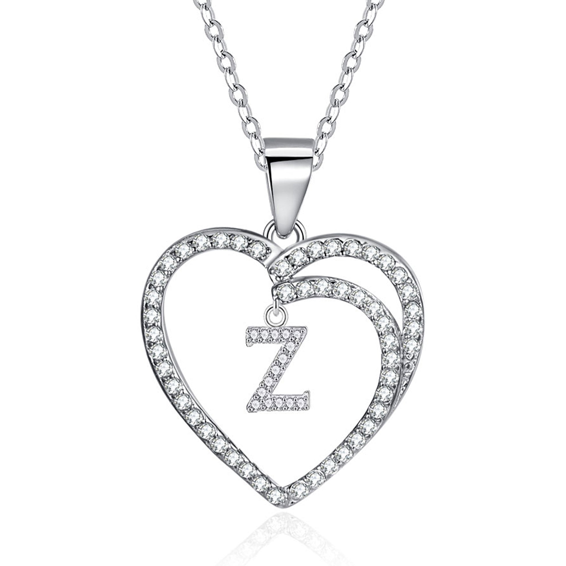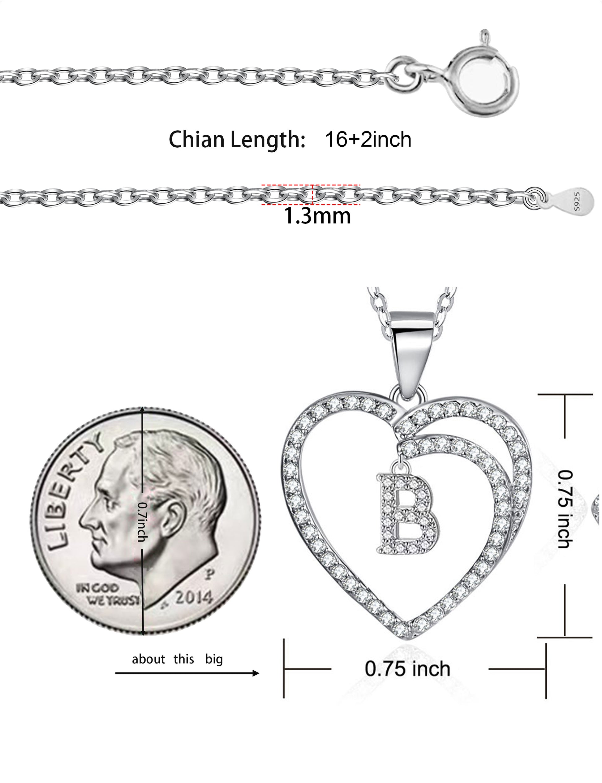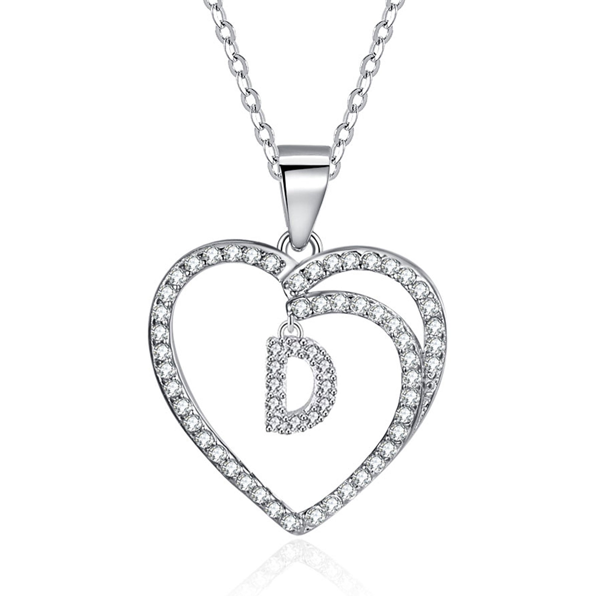 Silvery, double-sided heart-shaped first letter necklace, S925 silver plated necklace, zircon pendant necklace, suitable jewelry gift for girls;